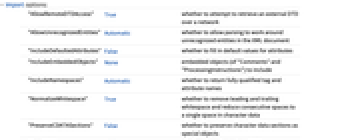 "AllowRemoteDTDAccess" True whether to attempt to retrieve an external DTD over a network "AllowUnrecognizedEntities" Automatic whether to allow parsing to work around unrecognized entities in the XML document "IncludeDefaultedAttributes" False whether to fill in default values for attributes "IncludeEmbeddedObjects" None embedded objects (of "Comments" and "ProcessingInstructions") to include "IncludeNamespaces" Automatic whether to return fully qualified tag and attribute names "NormalizeWhitespace" True whether to remove leading and trailing whitespace and reduce consecutive spaces to a single space in character data "PreserveCDATASections" False whether to preserve character data sections as special objects "ReadDTD" True whether to read an external DTD "ValidateAgainstDTD" Automatic whether to validate the document against the specified DTD - Export options:
