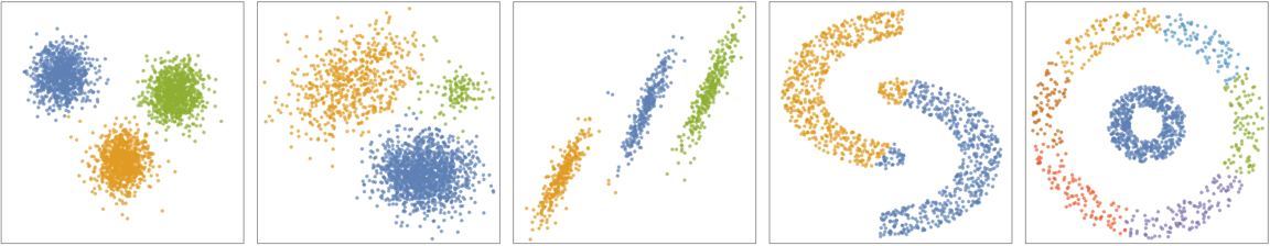 - The following plots show the results of the "MeanShift" method applied to toy datasets: