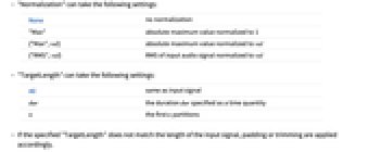 None no normalization "Max" absolute maximum value normalized to 1 {"Max",val} absolute maximum value normalized to val {"RMS",val} RMS of input audio signal normalized to val - "TargetLength" can take the following settings: