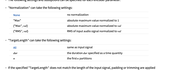 None no normalization "Max" absolute maximum value normalized to 1 {"Max",val} absolute maximum value normalized to val {"RMS",val} RMS of input audio signal normalized to val - "TargetLength" can take the following settings: