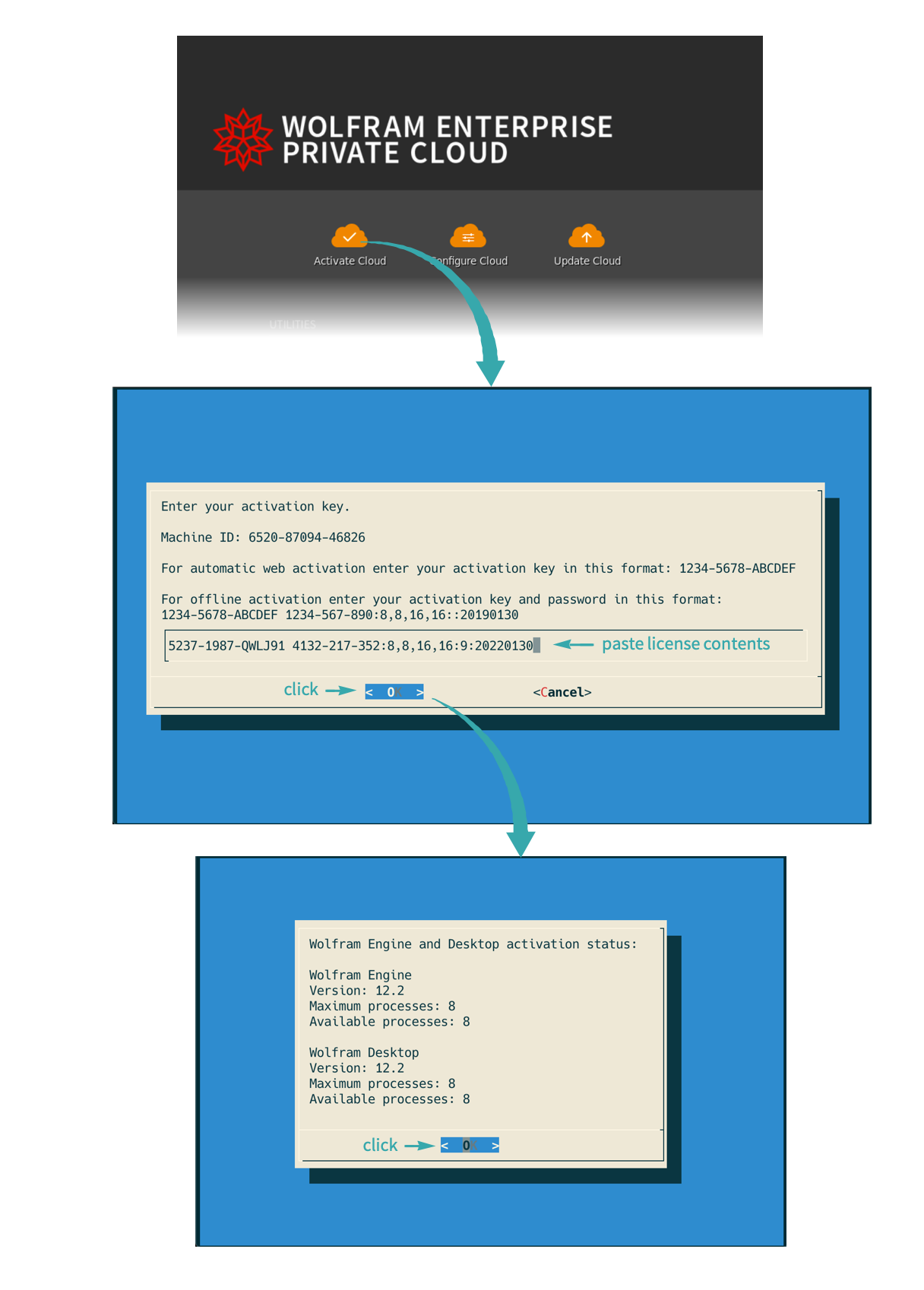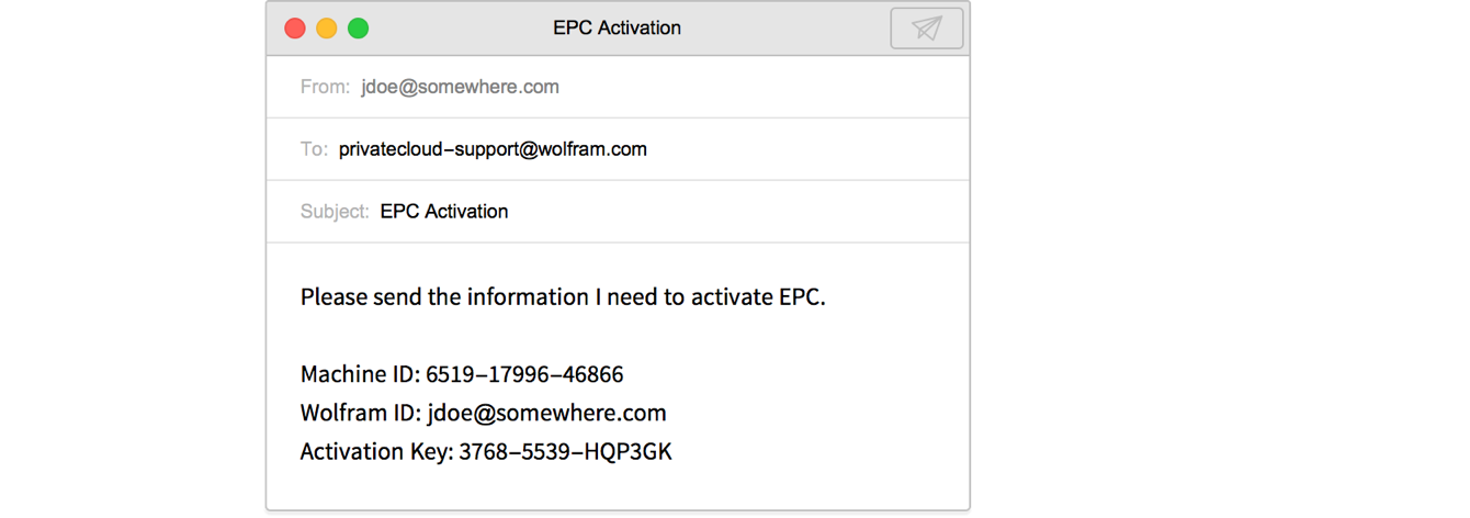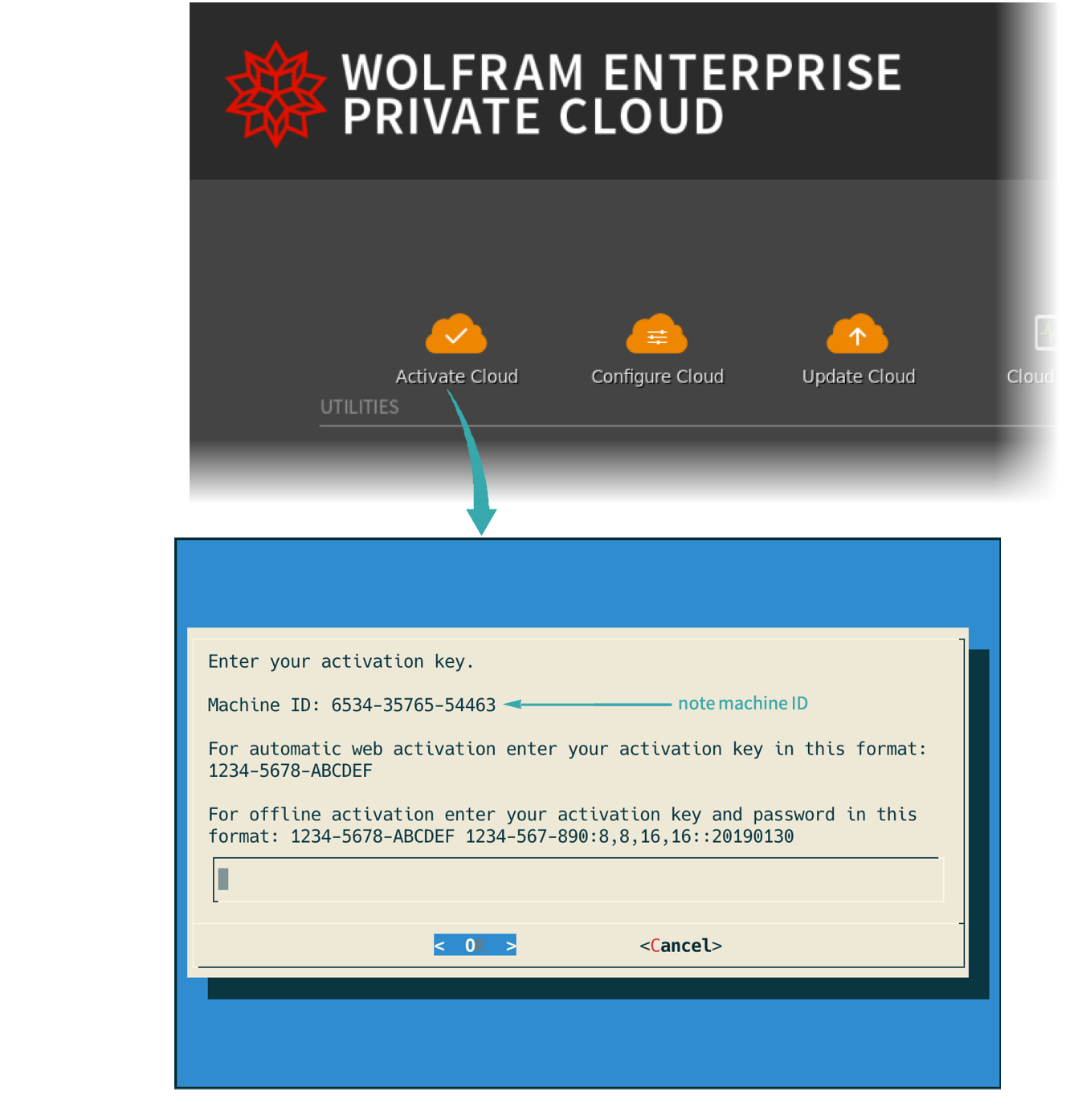 From a different machine that has email access, send an email to privatecloud-support@wolfram.com with your machine ID, Wolfram ID and activation key. Our support team will reply within one business day with the necessary information to proceed with the activation: