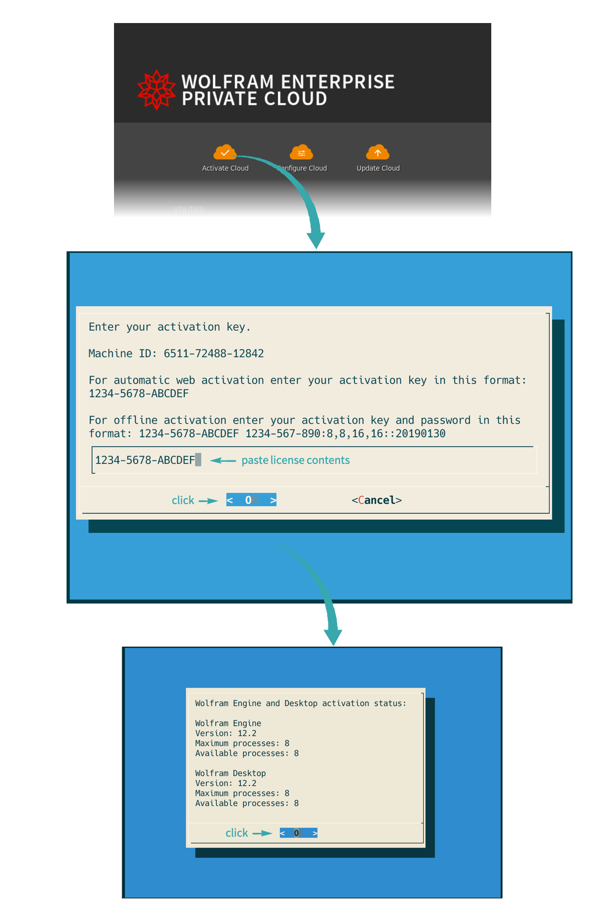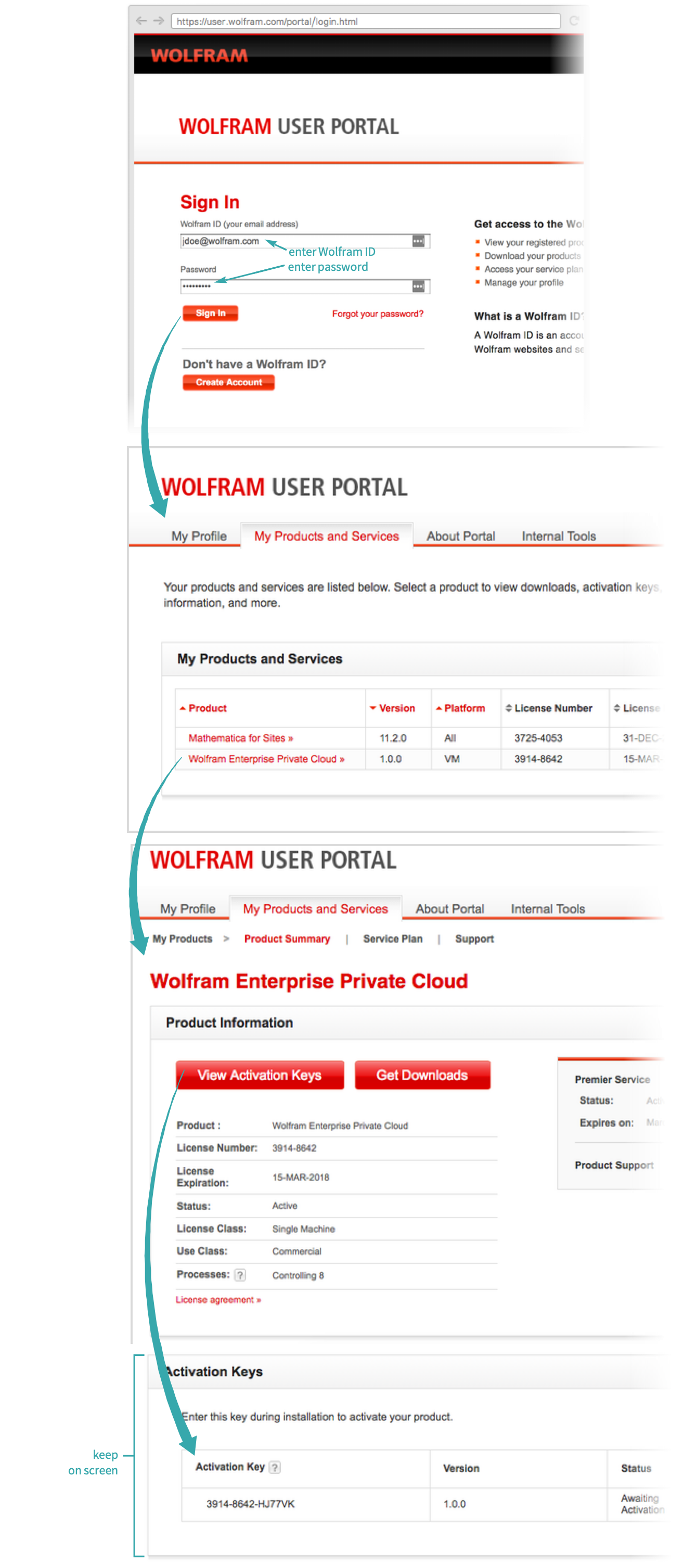Sign in to the Wolfram User Portal and select the My Products and Services tab. Click Wolfram Enterprise Private Cloud and then View Activation Keys. Keep this window on screen for the next step: