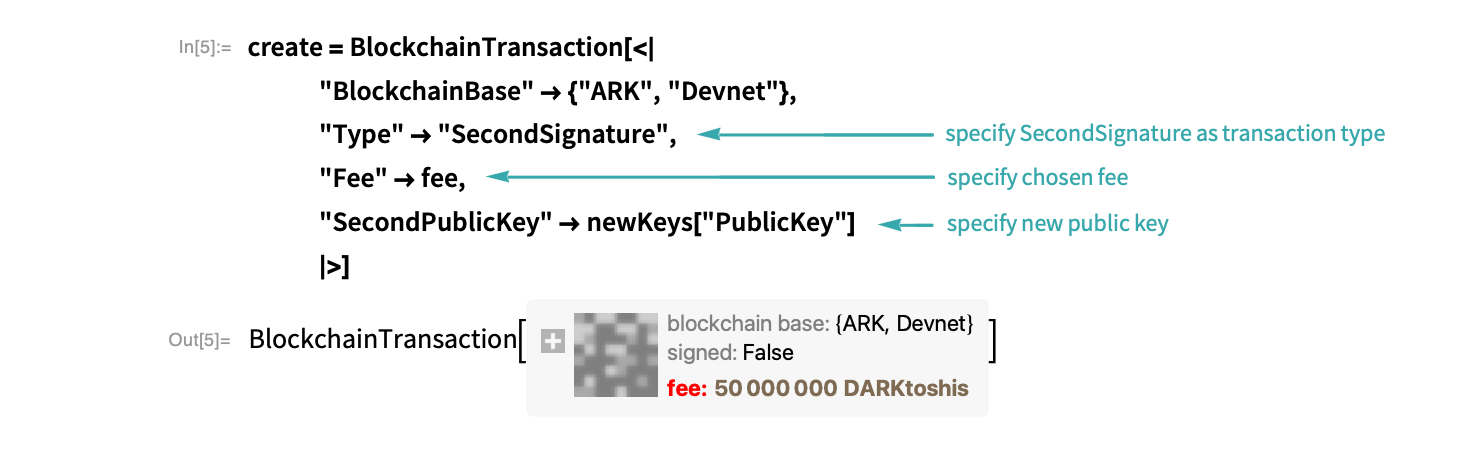 Use BlockchainTransaction to build the transaction object with the chosen fee and the new public key: