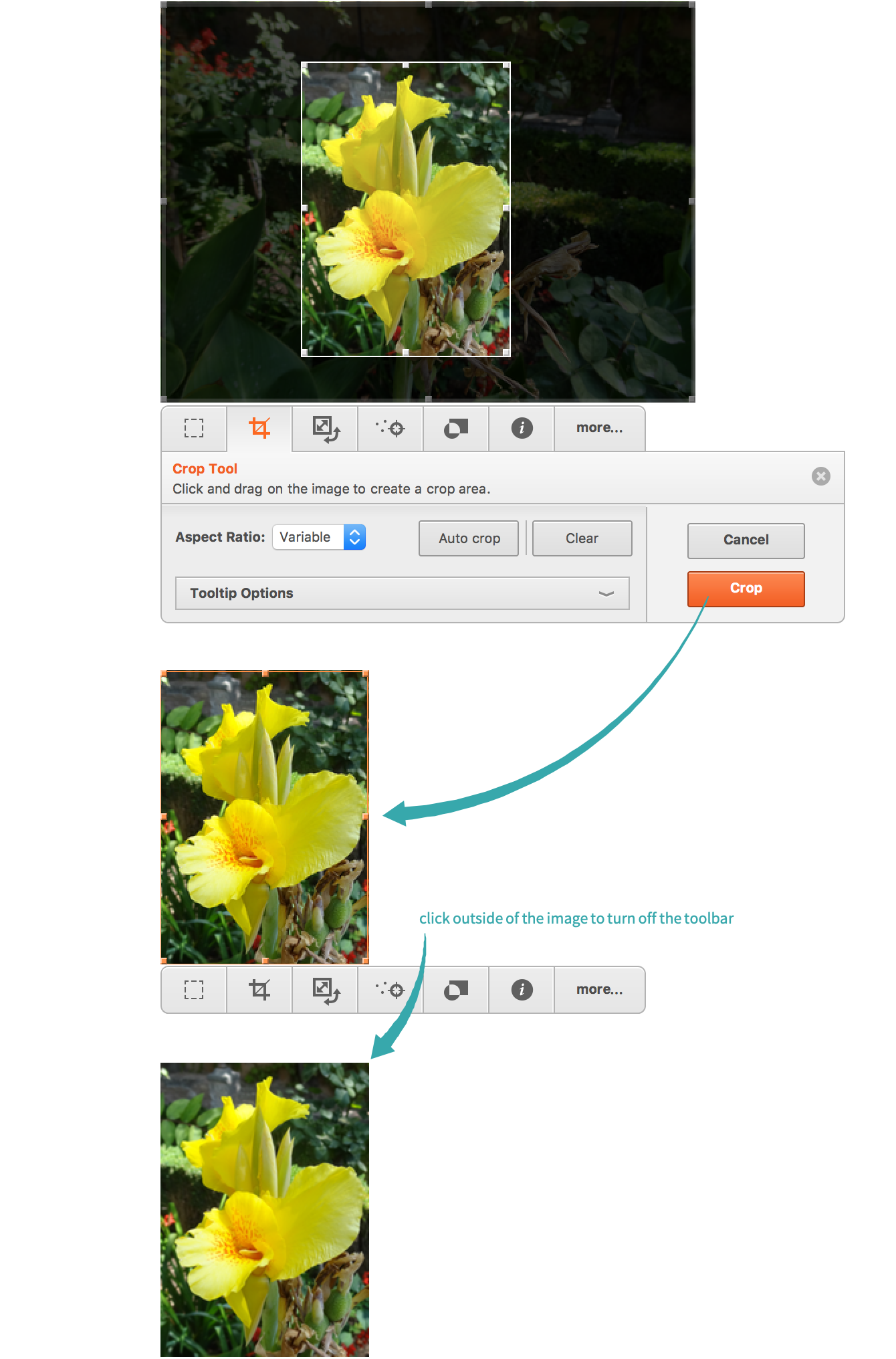 Click Crop to crop the image. Click outside of the image to turn off the toolbar: