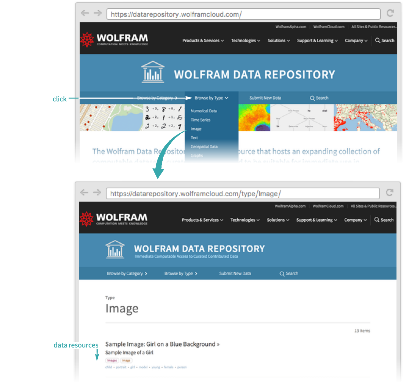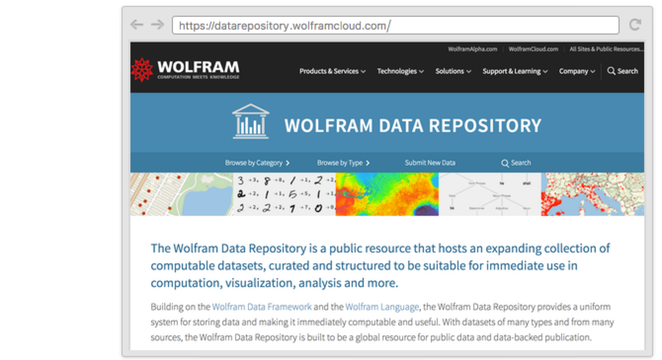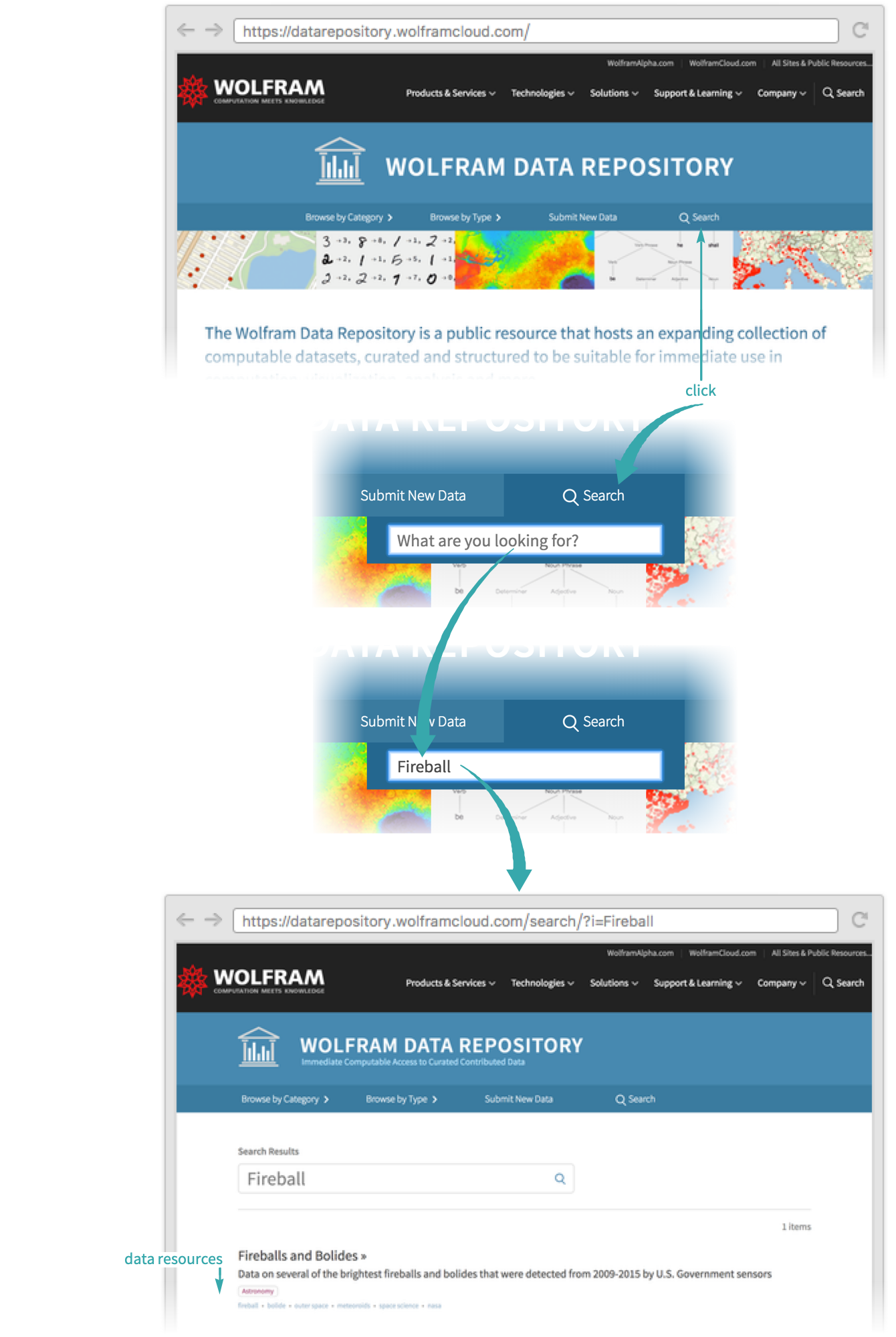 To search, click Search under the Wolfram Data Repository title (not the sitewide Search at the top of the page) and enter a search term: