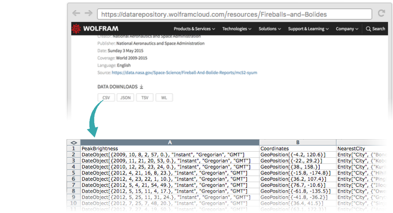Data can also be downloaded in other formats for use outside of the Wolfram Language. Scroll to the bottom of the Data Resource page. If the data is available for download, there will be a “Data Downloads” section. Click the format you want to download: