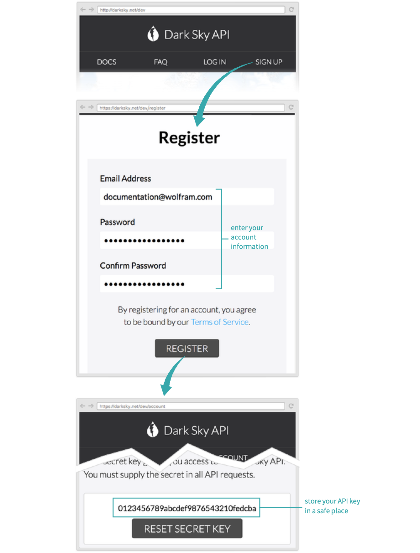 Some APIs require the use of a key, which you obtain when you register to use the site. Store the key in a safe place; you will need it whenever you access the API:
