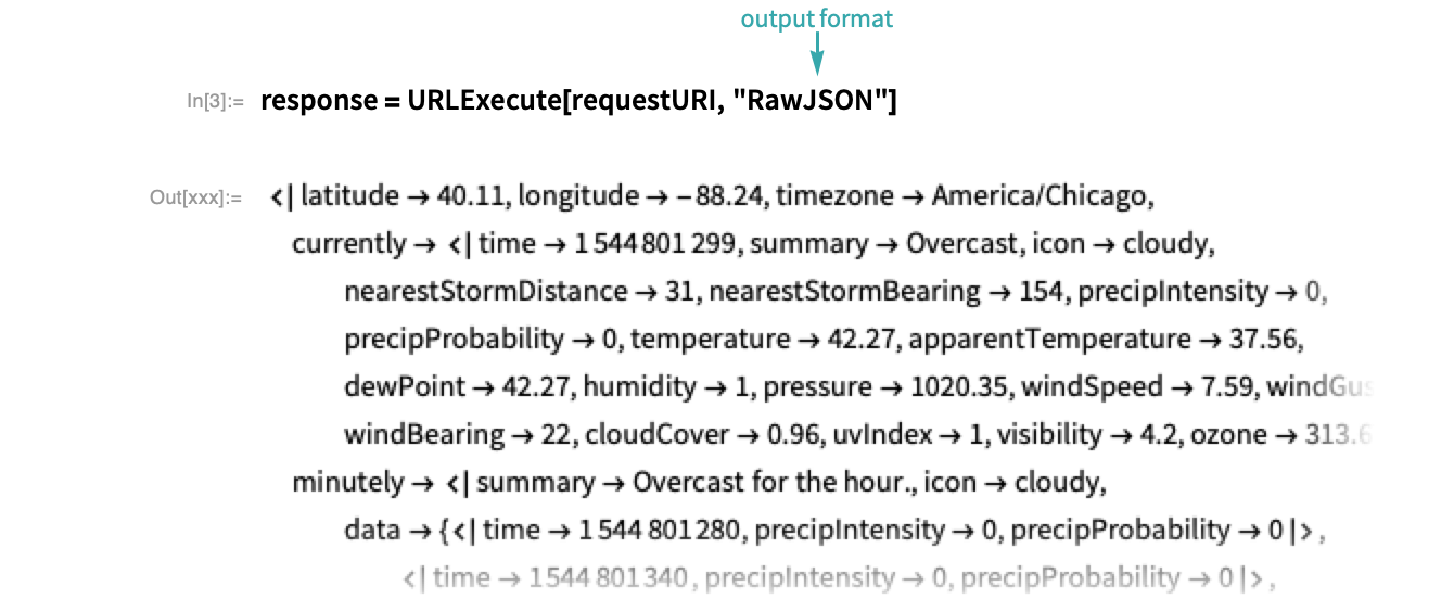 Send the request URI to the API, retrieving forecast information in "RawJSON" format: