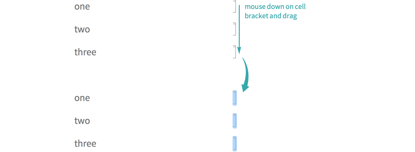 Mouse down on a cell bracket and drag to select a range of cells: