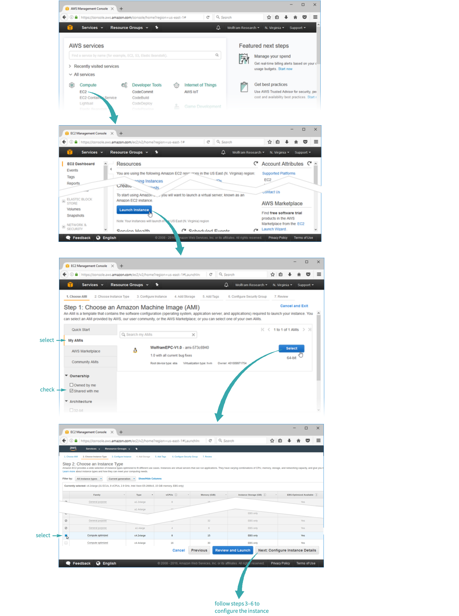 Log into your account at aws.amazon.com. From the AWS Management Console, open the EC2 Dashboard, and create and configure an instance of the Amazon Machine Image. We recommend selecting instance type c4.2 xlarge, although this can vary based on your needs: