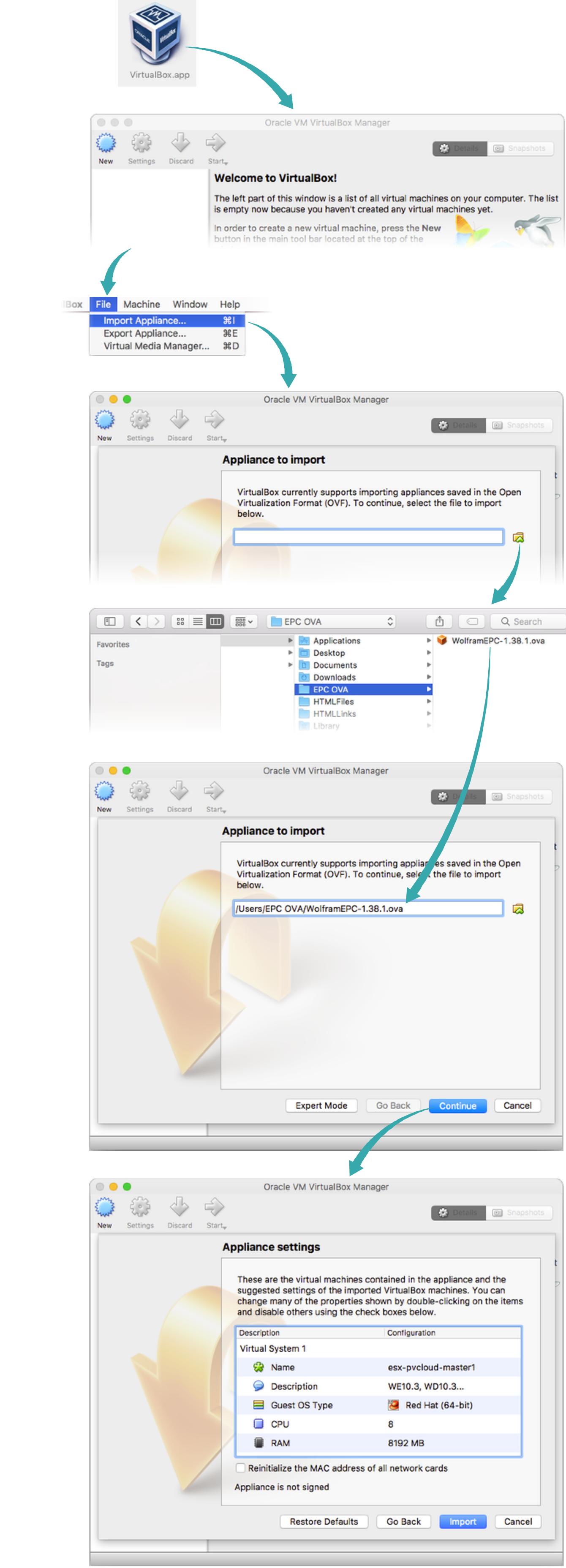 Open the VirtualBox application and import the Wolfram EPC appliance you downloaded:
