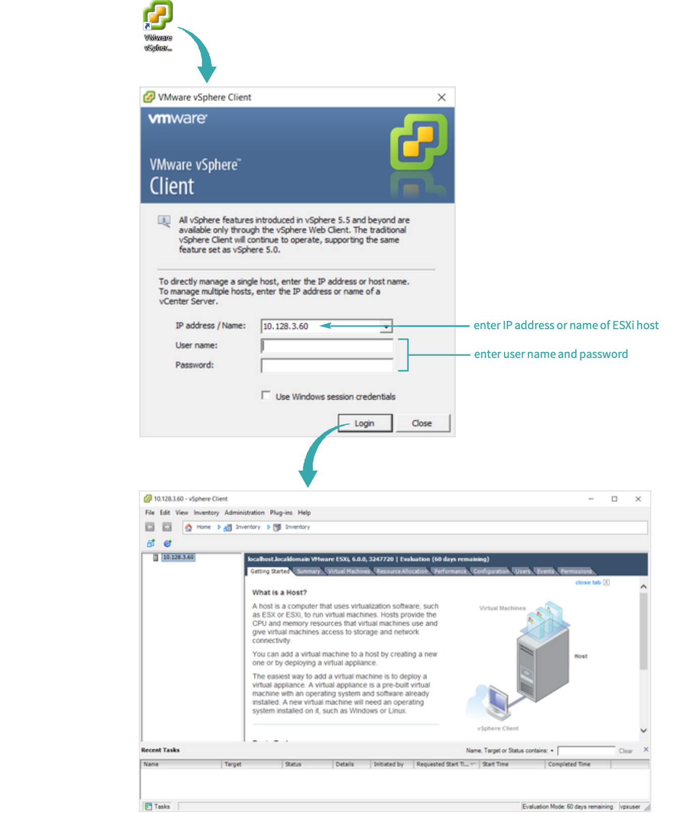 From your desktop, click the VMware vSphere Client icon and log on to vSphere Client:
