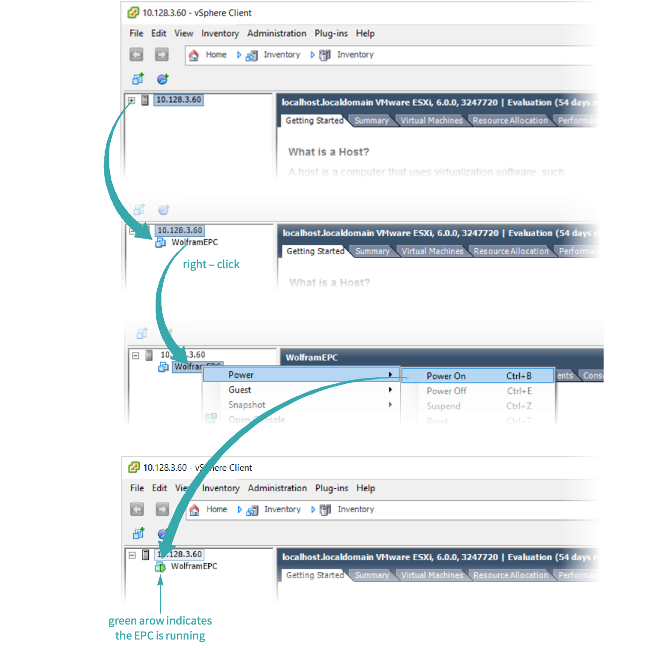 In the main window, click the plus sign (+) to the left of the host icon, then right-click Wolfram EPC and choose Power ▶ Power On: