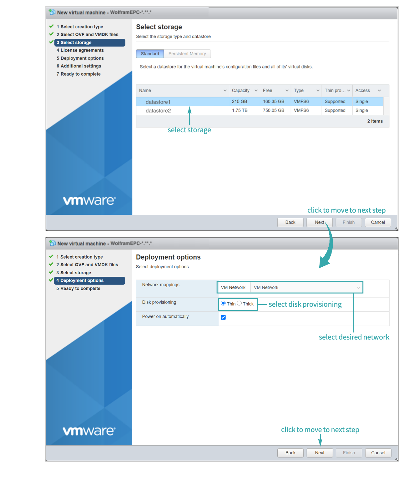 Select the storage location, network and other deployment options for the virtual machine: