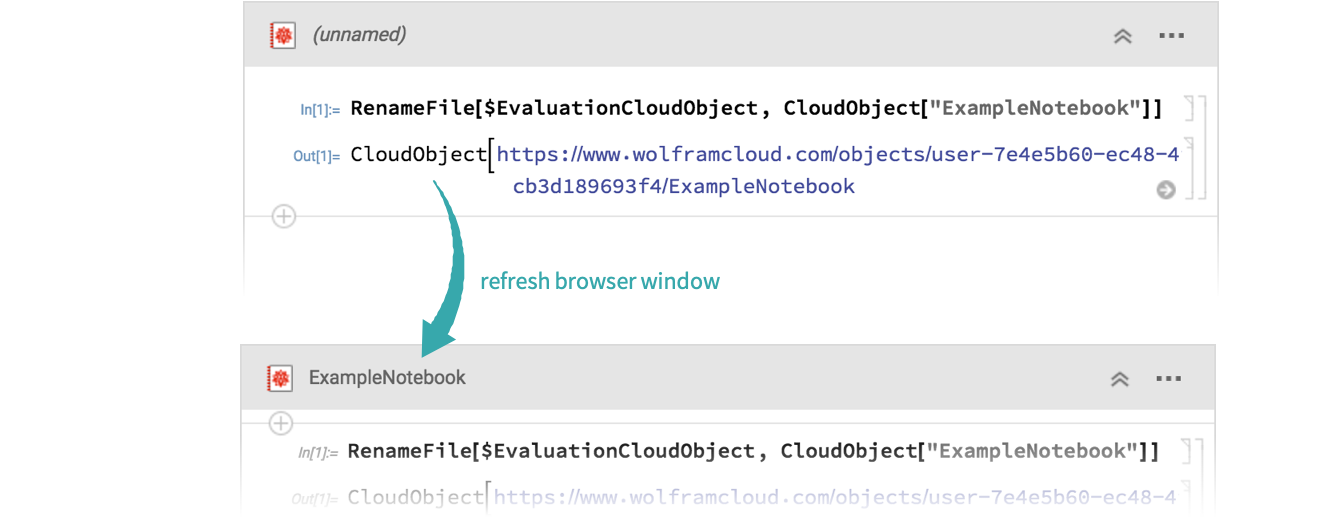 Name or rename a cloud notebook using RenameFile. Refresh the browser window to see the name change: